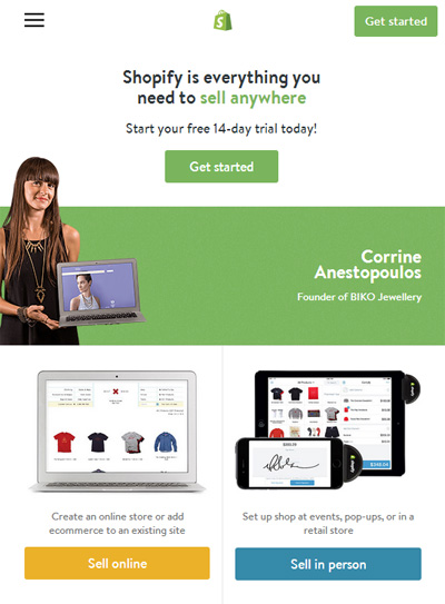 我们发现,Shopify 并没有像 Amazon 一样采用复杂的页面布局,更没有放置太多的内容在首页,这使他们可以轻而易举地实现响应式布局。简洁的网站设计可以让访客以最快的速度找到自己想要的东西。